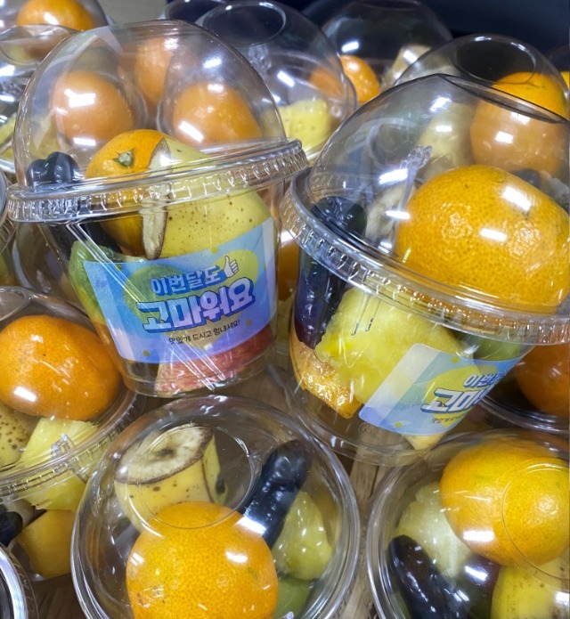 이번 페이-데이에는 제철 과일을 담은 컵과일을 준비했습니다.